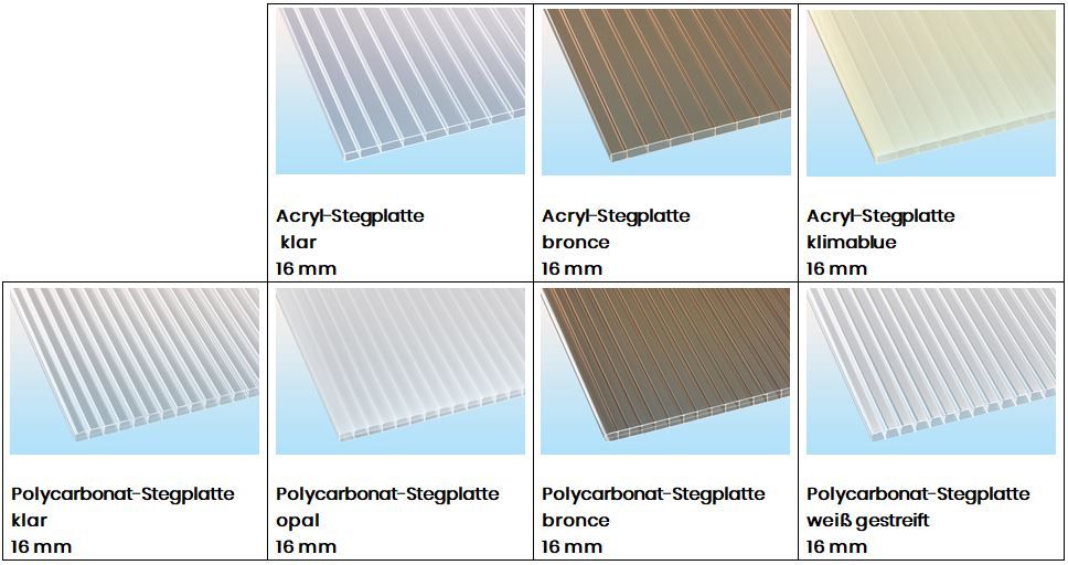 skaidrus polikarbonatas, bronzinis polikarbonatas, matinės baltos spalvos polikarbonatas, baltai dryžuotas polikarbonatas (zebros lakštas), skaidrus akrilas, bronzinis akrilas, mėlynas akrilas (sumažina įkaitimą iki 75 %).