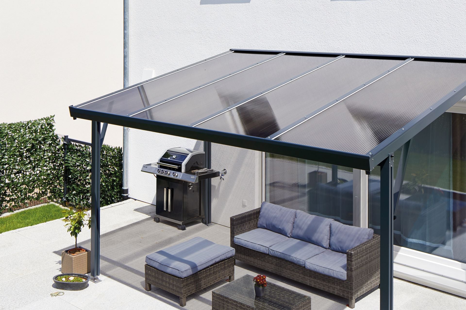 För ännu mer flexibilitet erbjuder vi även Premium-terrasstaket i en fristående version. Ett extra fundamentankare på baksidan gör att det kan installeras bort från husets vägg. Detta gör att det kan placeras var som helst i trädgården, gården eller på terrassen.